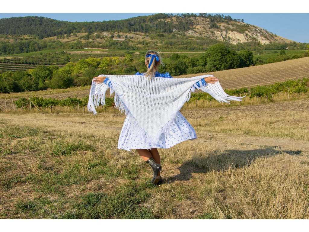 Rozměry: 200 cm na horní straně, 100 cm v cípu + třásně